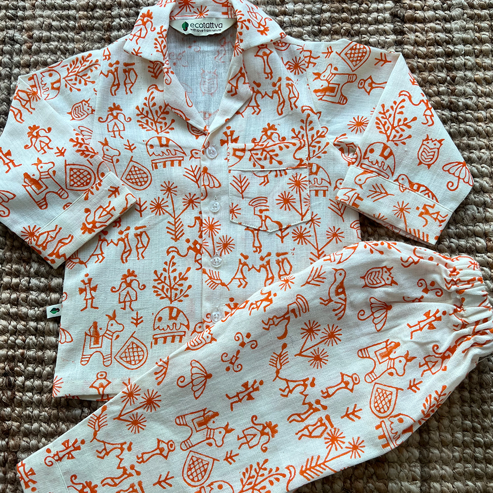 Orange Tribal Print Muslin Khadi Cotton Kids Night Suit